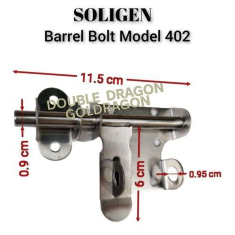Grendel/Slot/Barrel Bolt- Merk : SOLIGEN- Model : 402- Material : Stainless Steel - Ukuran : 4"HARGA PER PC(Sudah termasuk Sekrup)Dimensi :- Panjang seluruh slot = 11,5 cm- Diameter slot = 9 mm (= 0,9 cm)- Panjang x Lebar Pegangan Slot = 6 cm x 2,2 cm- Tebal Plat = 1 mm (= 0,1 cm)- Dimeter lubang gembok = 9,5 mm (= 0,95 cm)- Panjang dudukan plat atas = 6,5 cm- Panjang dudukan plat bawah = 4,2 cm- Dimensi plat lawan = 2,1 cm x 4