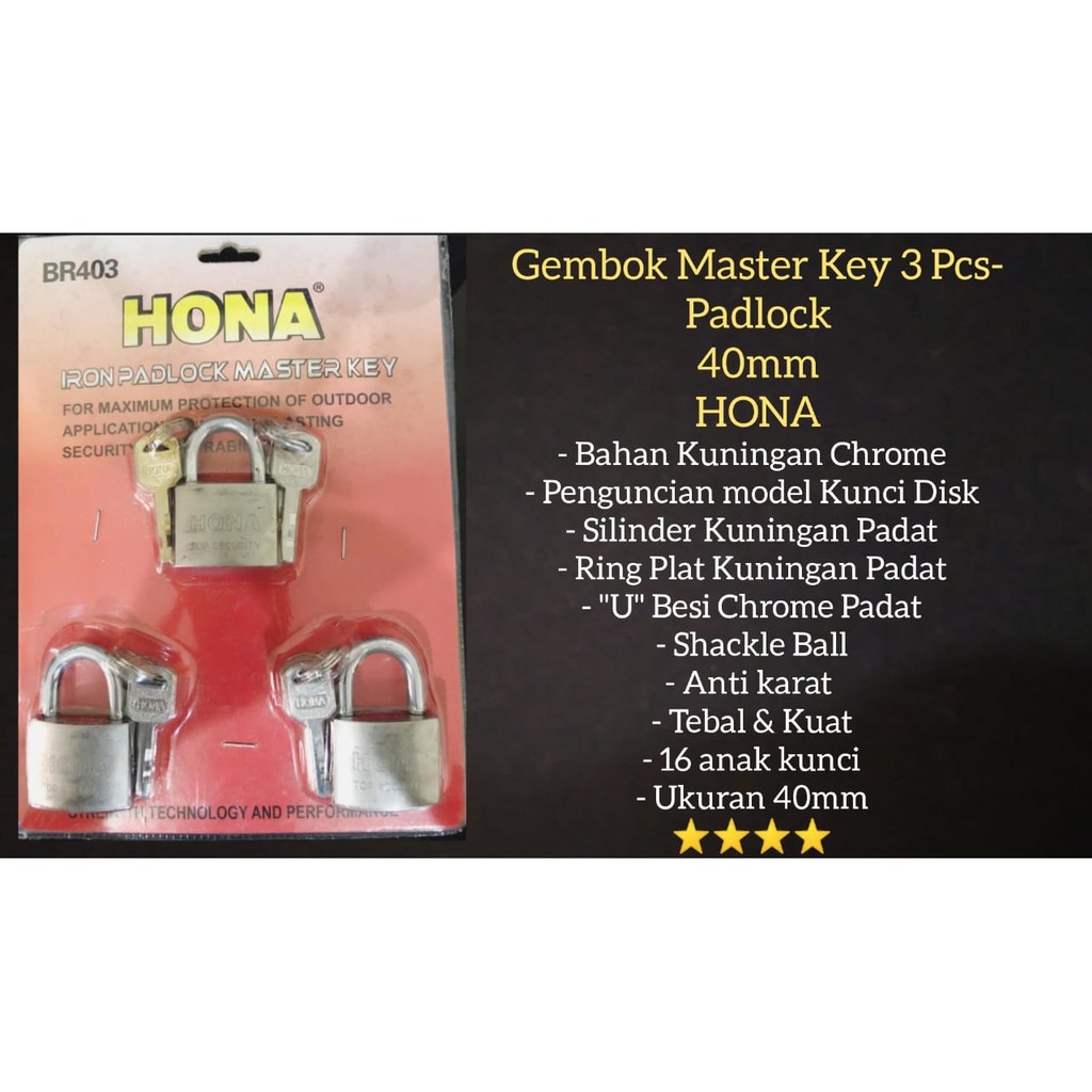 Deskripsi Gembok Master Key 3 pcs 40 mm HONA- Iron PADLOCK Master Key BR403Bahan Kuningan ChromePenguncian model KUNCI DISkSilinder Kuningan PadatRing Plat Kuningan Padat"U" besi chrome padatModel penguncian Bola bajaAnti KaratTebal & Kuat3 anak kunciplus 3 cadangan anak kunciNOTE :Di wajibkan setiap pembukaan packing melakukan video , jika barang rusak/kekurangan barang akan di validasi melalui video , jika tidak ada bukti video maka di anggap tidak sah untuk komplain maupun resolusiOPEN RESELLER / DROPSHIPPER Reseller & Partai Besar akan medapatkan harga khusus (langsung chat kami). Kuy jadi Dropshipper kami & dapatkan penghasilan tambahan* JANGAN LUPA FOLLOW KAMI UNTUK MENDAPATKAN INFORMASI TERUPDATE PRODUK - PRODUK TERBARU DENGAN HARGA TERMURAH * MELAYANI PEMBELIAN GROSIR DENGAN HARGA PASTI MURAH !!!! SILAHKAN CHAT KAMI (FAST RESP